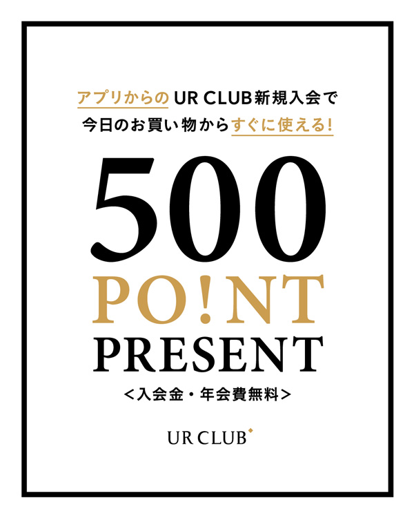 アーバンリサーチ公式アプリからUR CLUBに新規入会いただいた方へ、ご入会日のお買い物からすぐにお使いいただける500ptをプレゼントいたします。新規入会はこの機会がおすすめです!