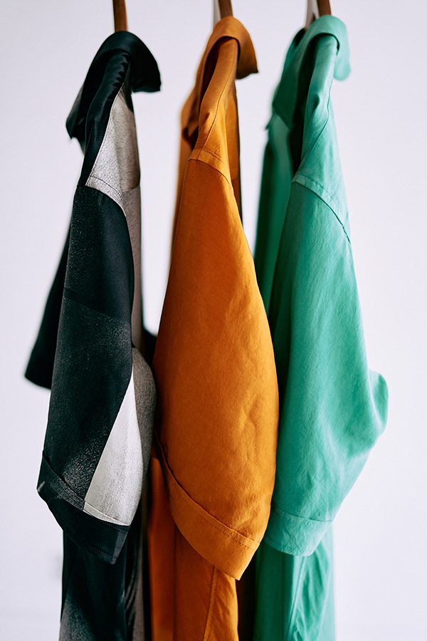 バイヤーのワードローブのシャツ部門を占める〈semoh(セモー)〉と共に、この夏に映える、グラフィカルかつ鮮やかな半袖シャツを一から制作した。ひとつは〈semoh〉が今期コラボレーションしているアーティストEI KANEKOのペンシルアートのコラージュプリント。繊細さとパワーが共存する、刺激的な一枚に仕上がった。型はレギュラーカラーのフレンチフロント、袖はW仕上げ。一見シンプルながら、袖を通した時に感じる〝余白〟に、心地よさを感じてもらえるはずだ。もうひとつはブランドが得意とする手法のボタニカルダイで染色したもの。セージで染めた爽やかなグリーンと、アーティチョークで染めた鮮やかなオレンジが目を惹く2色。手染め独特のムラと素材の落ち感や発色は唯一無二だ。デザイナーのアーティスティックな感性が息づくアイテムは、カラーリングを引き立てるホワイトパンツやデニムなどと合わせて着こなしてほしい。