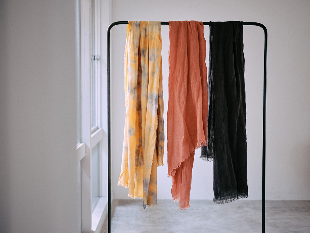 コットンとシルクの素材のスカーフは沖縄の土を使ってムラ染めをし、そのうえにパイナップルから作った炭の重ね染めが施された他では出せないタイダイの風合いが魅力的。リネンのストールも沖縄で天然染めをしており、柔らかな風合いはぜひ手に取っていただきたい1枚。大きめなサイズ感ですが薄手なのでかさばることなく持ち歩くことができます。シンプルなスタイリングのポイント使いはもちろん、冷房対策にもおすすめです。