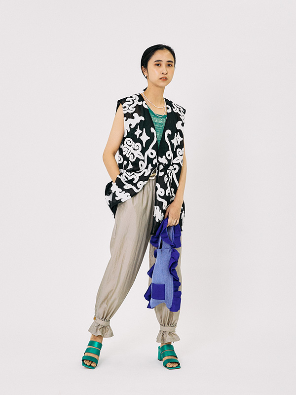 SEAN NISHの個性的な柄のベストは、スタイリングに取り入れていただくと一気にクールなイメージに。WANDERUNGの別注のニットタンクトップとサンダルの色味を合わせて、統一感をだしました。