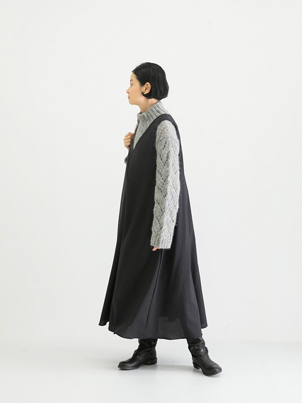 暖かい日のコーディネートとは打って変わって初冬の装いに。アームホールのつくりが大きく、ボリュームニットとのレイヤードも問題ありません。表情が全く異なるニットとワンピースですが、どちらもウールなのでまとまりと上品さが生まれます。足元をロングブーツで合わせて、アウターを羽織らなくても暖かいスタイリングに。