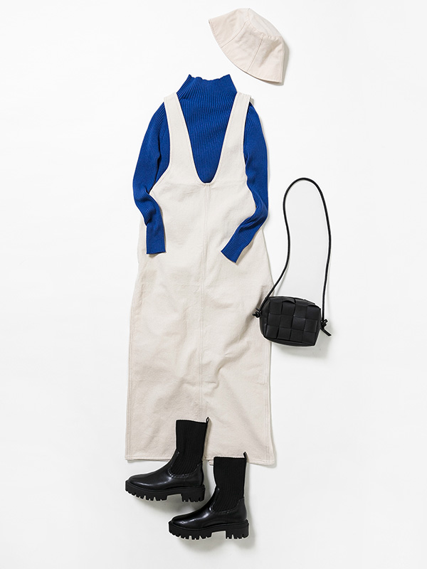 着回し力抜群、定番・インディゴカラーのジャンパースカート。