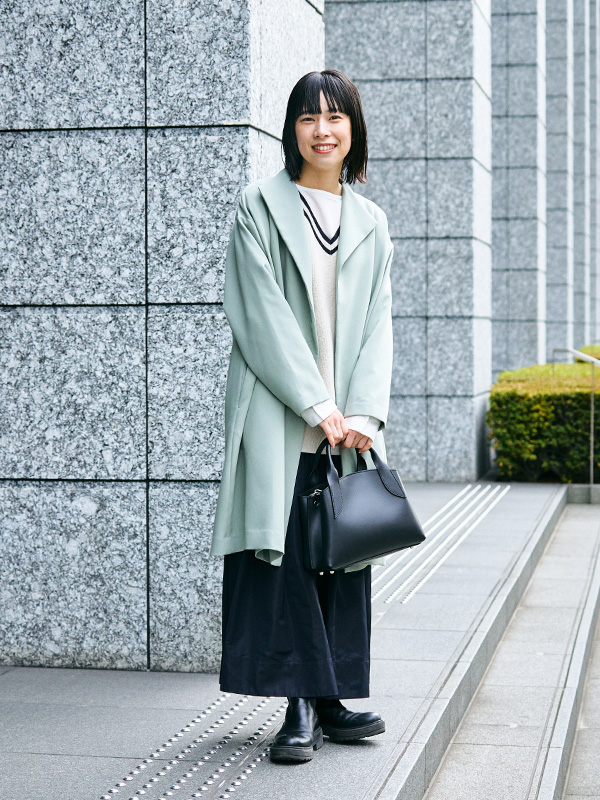 「ミントのアウターが主役の春の爽やかきれいめコーディネートです。ボトムス・シューズは暗色でしっかりと締めてアウターの甘さを抑え、トップスにも同系の色のラインが入ったものを選び、まとまりが出るよう意識しました」