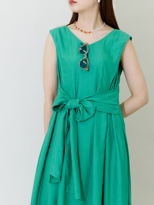 暑い夏こそおすすめしたいリネンのワンピース。シルエットもきれいで一枚でさらっと着てコーデが完成するのが嬉しい。ウエストのリボンはセンターよりも少し横にずらして結ぶのが甘すぎずに着ていただけるポイント◎