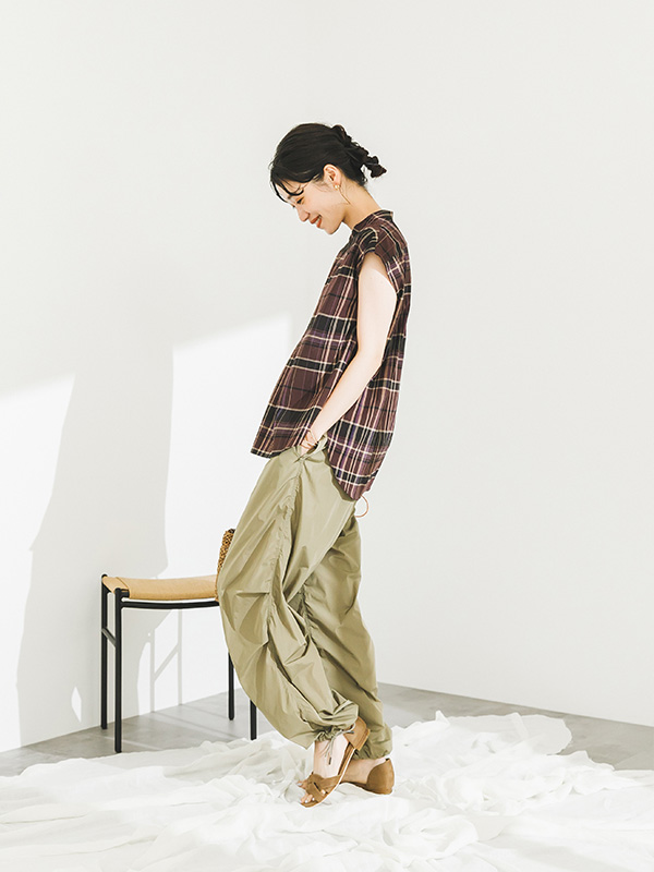 きちんと上まで留めたチェックのシャツとかごバッグ。正統派なスタイルもパラシュートパンツを合わせて肩の力が抜けた今年らしい雰囲気に。秋めいた色で季節を先取りしつつもフレンチスリーブで涼しく、暑い日を乗り切れそう!