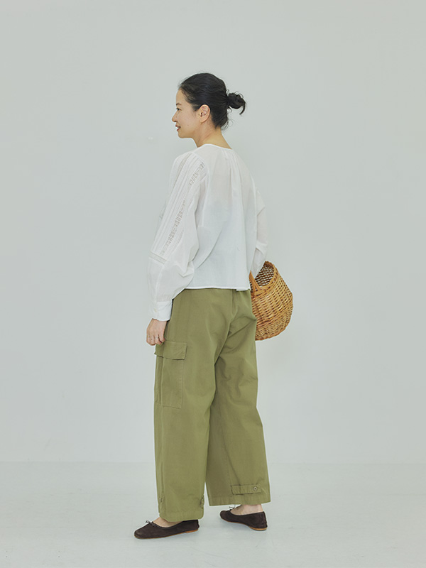 レース使いのブラウスにはミリタリーのディテールを取り入れたパンツを合わせて甘辛のバランスを取っています。シンプルな装いにバスケットやバレエシューズなどフレンチテイストの小物をアクセントとしてプラス。