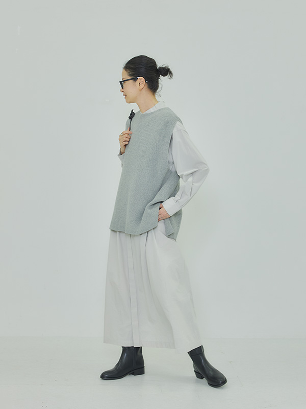 暑い時期から取り入れやすいドライタッチな風合いが特徴のニットベスト。 サイドスリットが入っているので着膨れせず、やや前後差のある丈感がヒップ周りをさり気なくカバーしてくれるところが嬉しいポイント。アームホールの開き具合もちょうどよく重ね着しやすいデザインで、 カットソーに合わせたラフな着こなしからシャツに合わせたオフィスカジュアルまで、レイヤードスタイルには欠かせない万能アイテムです。