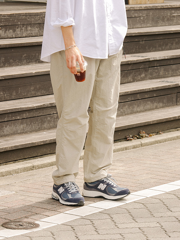 涼しくなってきたらスウェット1枚でお出かけしたくなりますね。このパンツは撥水性があり軽くてアウトドアシーンに最適です。機能も優れていますがナイロン100%なのに風合いのある肌触りの良い素材がとても気に入っています。スポーティさを削ぎ落とされたパンツを活かし、シンプルでカジュアル過ぎないコーディネートに。