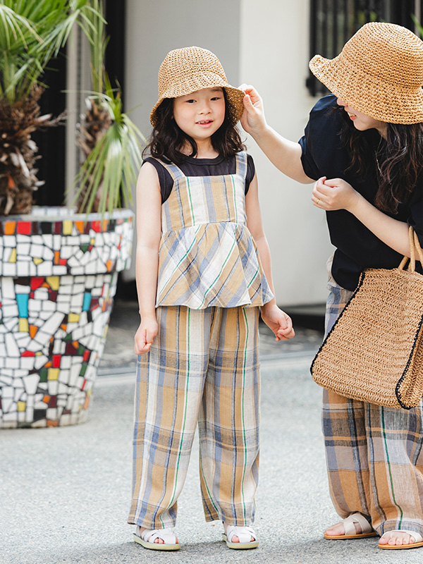 燦々と輝くお日様の光を纏ったような、やさしいイエローのチェック柄が目を引くナチュラルコーディネート。