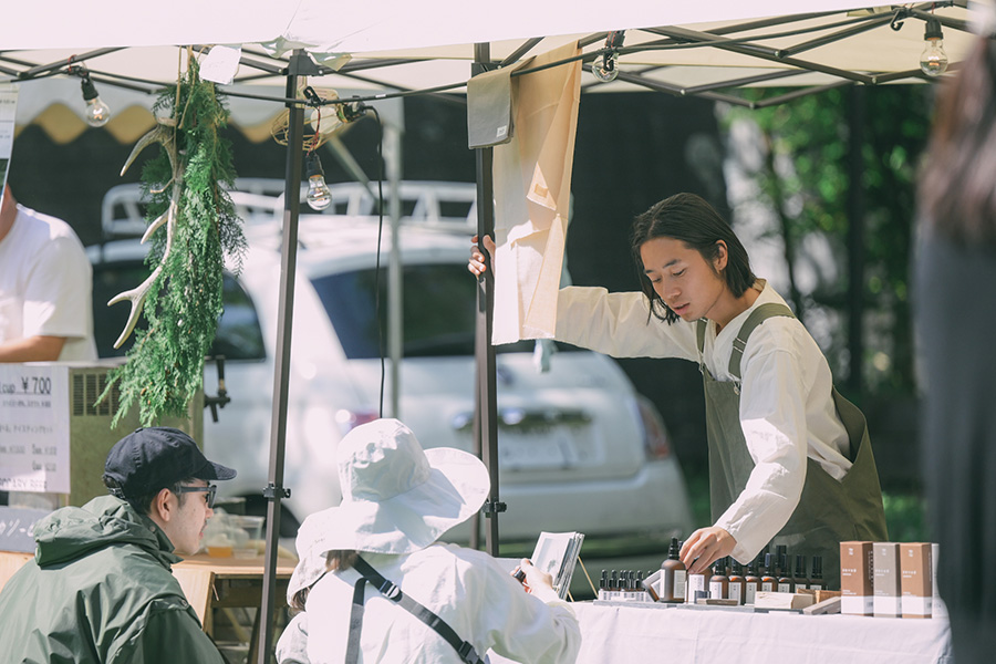 四季折々に素敵な景色を見せてくれたキャンプ場の自然にも感謝する1日。普段はなかなか見れない施設管理の一貫で行われる樹木伐採を見学し、その樹木を使った蒸留体験、サンタを作るグリーンウッドワーク体験、焚き火体験など目の前の自然資源が暮らしに循環していくキャンプ場ならではの体験を用意。半径30km圏内の顔の見える生産者による野菜やお菓子、ドリンクが集うマーケットも同時開催!