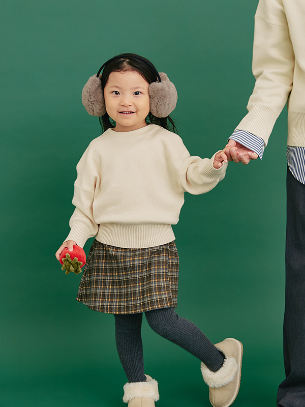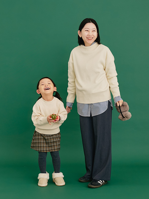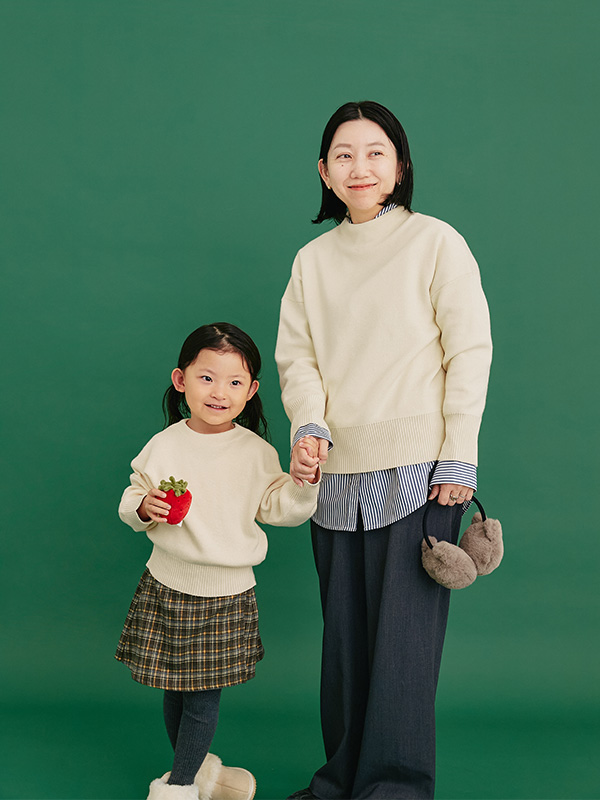 キッズもママも嬉しい、ソフトな質感が気持ち良いボトルネックニットが主役のスタイル。