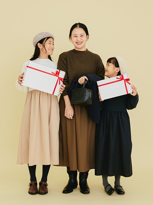 姉妹とママ、みんなおそろいのワンピースで、冬の特別な時間を楽しむスタイル。