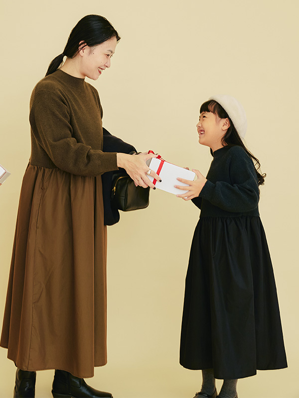 クリスマスらしい華やかさと、ふんわりスカートのやさしい質感がポイント。