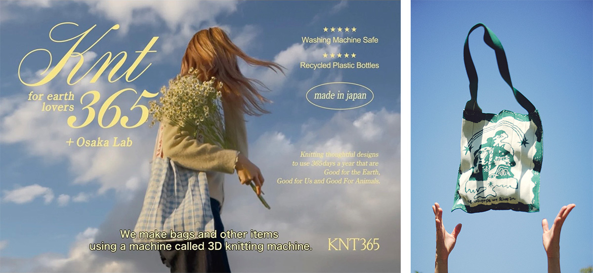 KNT365では、自分たちで企画、開発、デザインを行い、3Dニッティングマシンという機械のニッティング技術を用いて、バッグや、お洋服など様々なライフスタイルアイテムをつくっています。