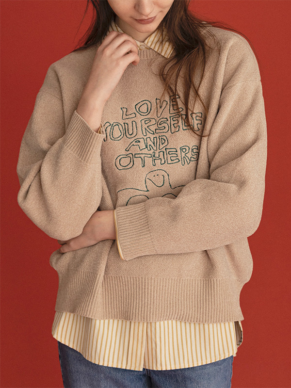 『LOVE』をテーマにオリジナルで描き下ろしていただいたイラストを刺繍したモールヤーンニット。
