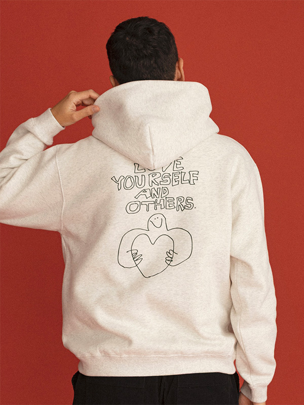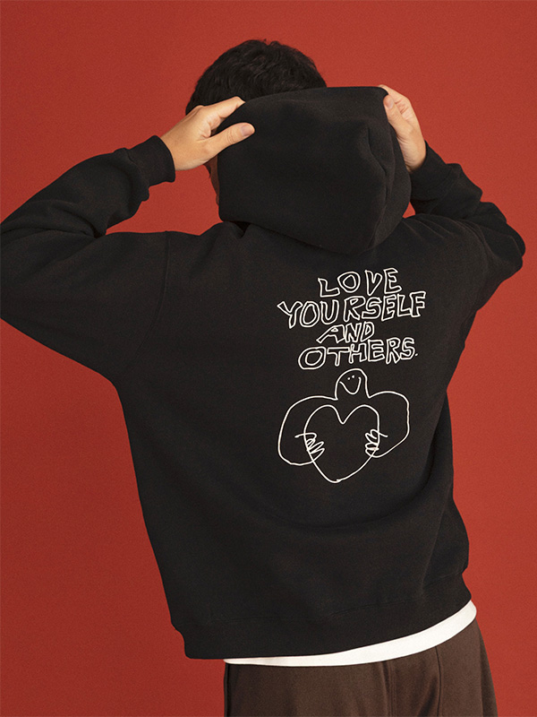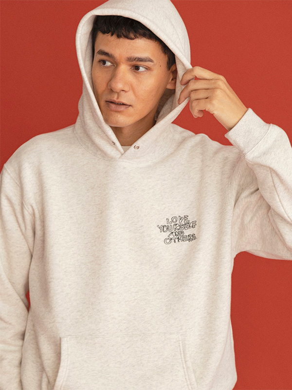 『LOVE』をテーマにオリジナルで描き下ろしていただいたイラストをバックに刺繍したスウェットフーディー。胸元にもメッセージロゴの刺繍をワンポイントに施しました。