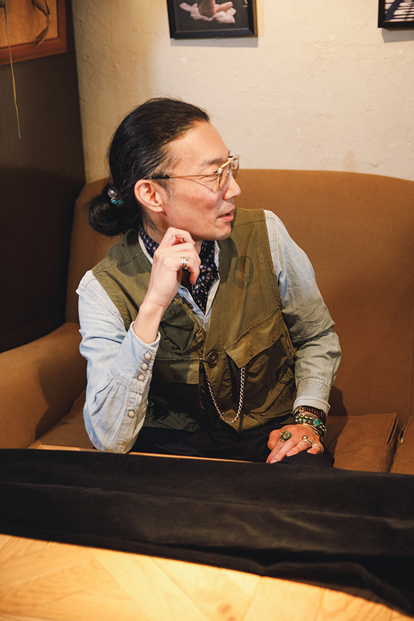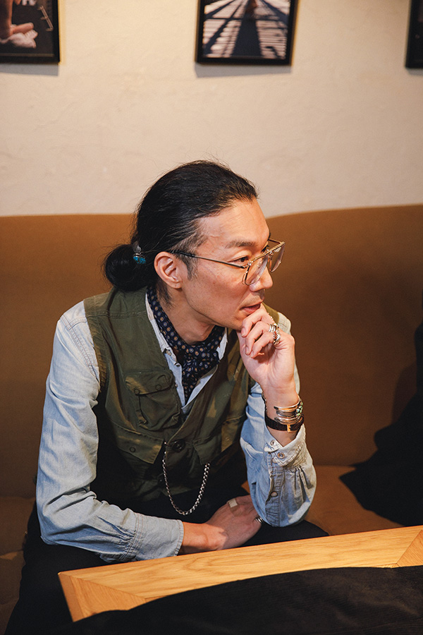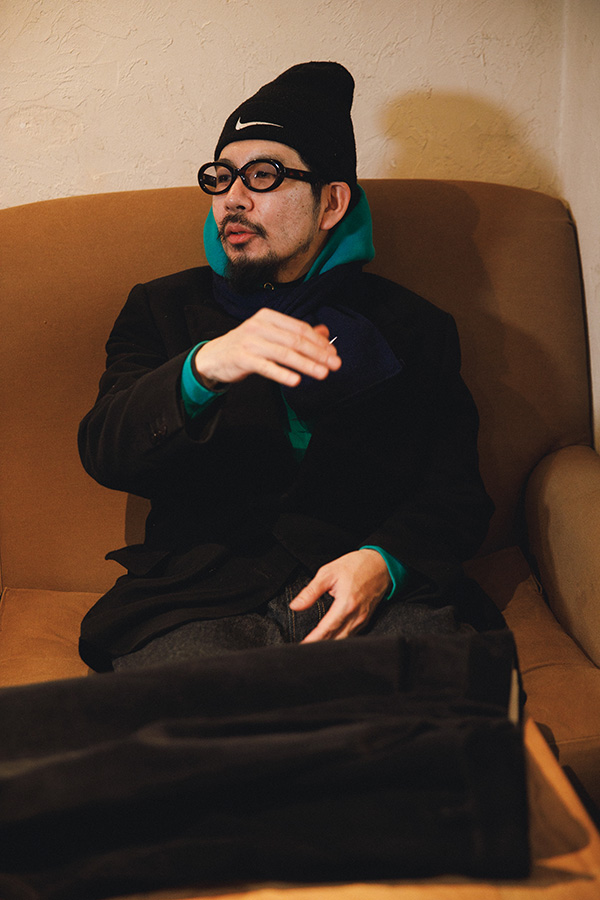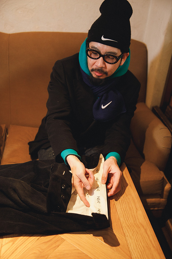 「以前、鼎談をさせていただいた際にも話しましたが、NEATを初めて穿かせてもらったときの衝撃はいまだ覚えています。特に印象深かったのがシルエット。スラックス自体はよく穿いていた方でしたけど、これまで見たことがない一本でした。振り返ってみると、自分が持っているNEATの中でよく穿いているのが旧型。新しいのがどうこうというわけではないですが、その引力の源というか、ブランドの根っこの部分に再び触れてみたい想いもあって今回話をさせていただきました」