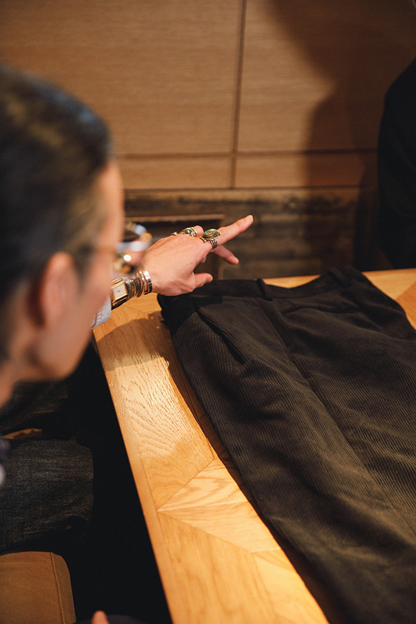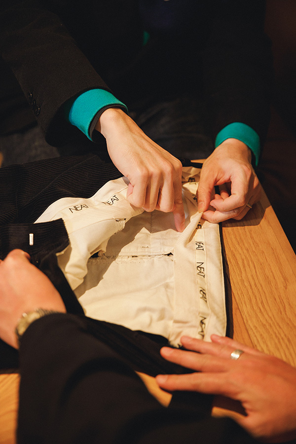 「当時、NEATの受注会ではブランドがスタートして間もないにも関わらず数え切れないほどのオーダーが入りました。そのオーダーを海さんに対応してもらっていたのですが、評判もすこぶる良かった。僕もNEATのパンツはすべて、海さんに裾上げやらお直しやらをお願いしていますからね」