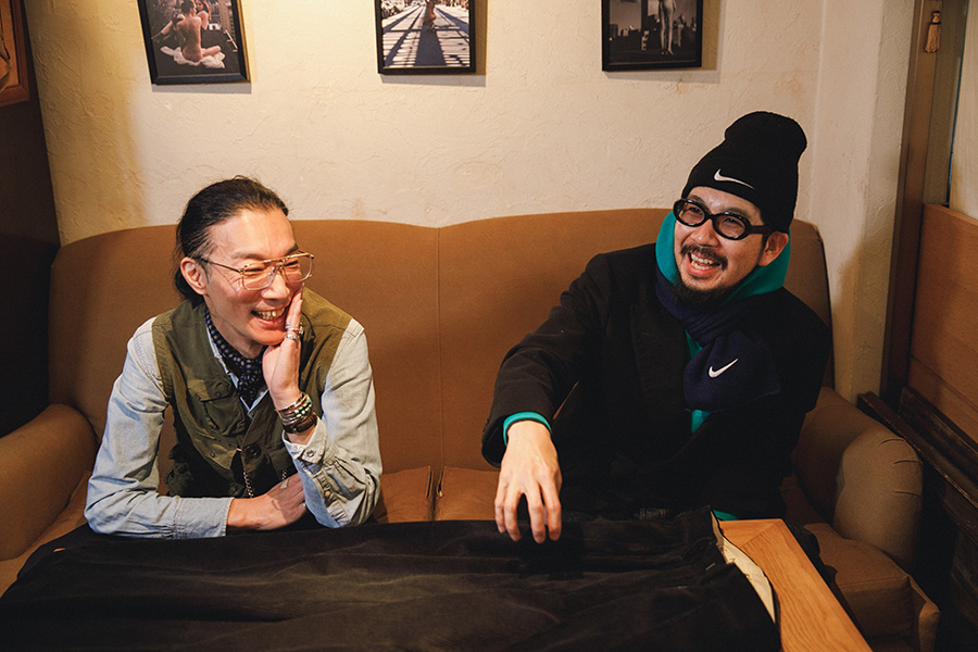 「そのときはまだメガネブランドのAYAMEのPRでしたよね。最初は自分の穿きたいパンツを作りたいとのお話でした。しかも自費で(笑)。アメリカの老舗のスラックスとイタリアの気鋭ブランドのパンツを持ってきて、これとこれを合わせたものを作りたいと。それこそ、ウチのカフェ(nucafe)の片隅で、ああでもないこうでもないと話しながら何度も試着を重ねていましたね」