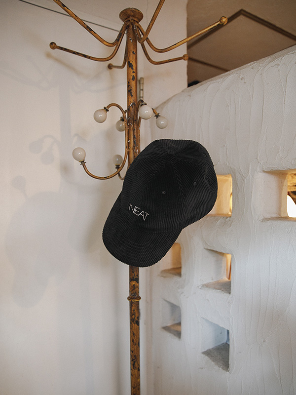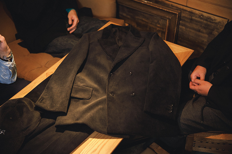 「襟もダブルだとピークドラペルが主流だと思うんですけど、僕、あのとんがったやつが嫌いなんですよね(笑)。なので、フィッシュマウスという襟にしています。いわゆるNEATのトップス版。カジュアルでも履けるスラックスならぬ、カジュアルでも着られるジャケットといったイメージですね。スラックスだけでなく、ジャケットやキャップからも僕らの根底に流れる想いや考えが伝われば嬉しいです」