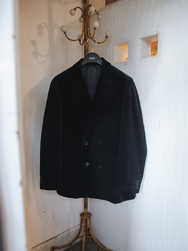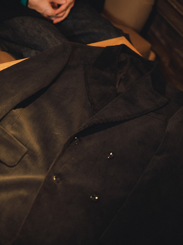 「僕らNEAT HOUSEではオーダーのジャケットをやっているのですが、その既製品というイメージです。僕らのジャケットの特徴は前身がハの字に広がるところ。ダブルでもボタンをしていなければほぼ重ならないんですよ。前が開く前下がりで、背中とジャケットの間がふんわりと空いてくるので、なんとなくカーディガンを羽織っている感覚で着てもらえると思います」