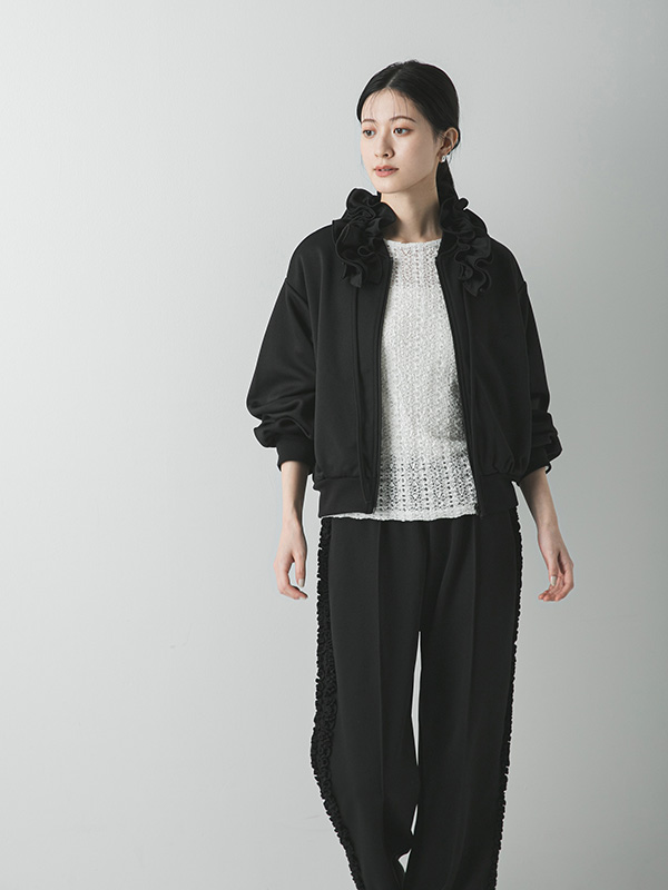 存在感のあるフリルカラーは取り外しが可能で、アクセサリー感覚で使用できるところもデザインポイント。シンプルなトラックジャケットとしても着用が可能なため、幅広いスタイリングにマッチします。