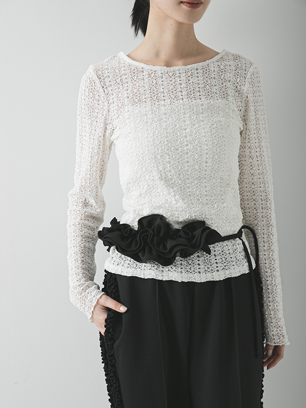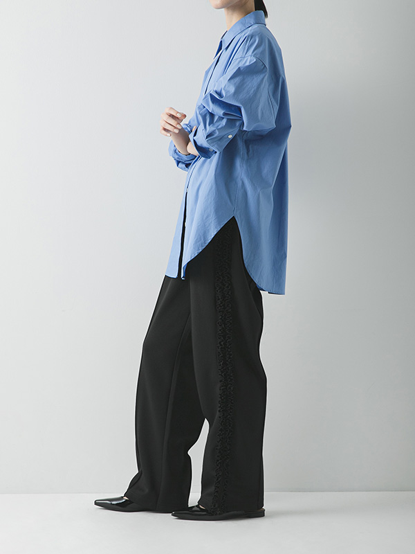 カジュアルな要素を残しつつ、女性らしいフリルデザインを融合させたモード感溢れる一着。