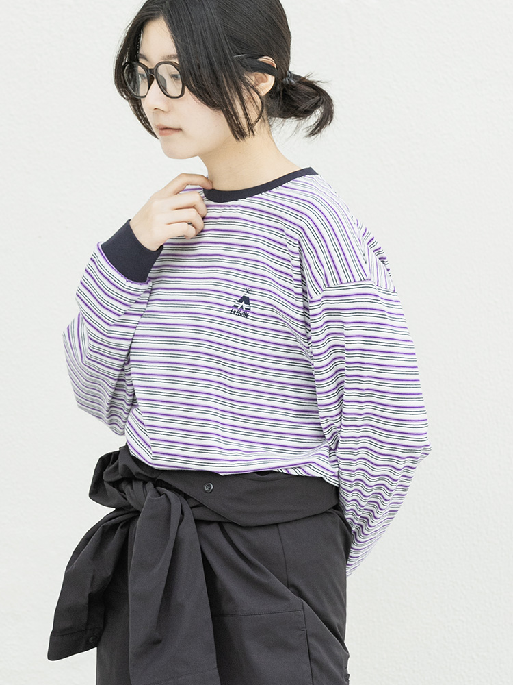 カジュアルの中に女性らしさが漂う細いラインのボーダーとなっており、スウェットやジャケットのレイヤードとしての着用もおすすめです。