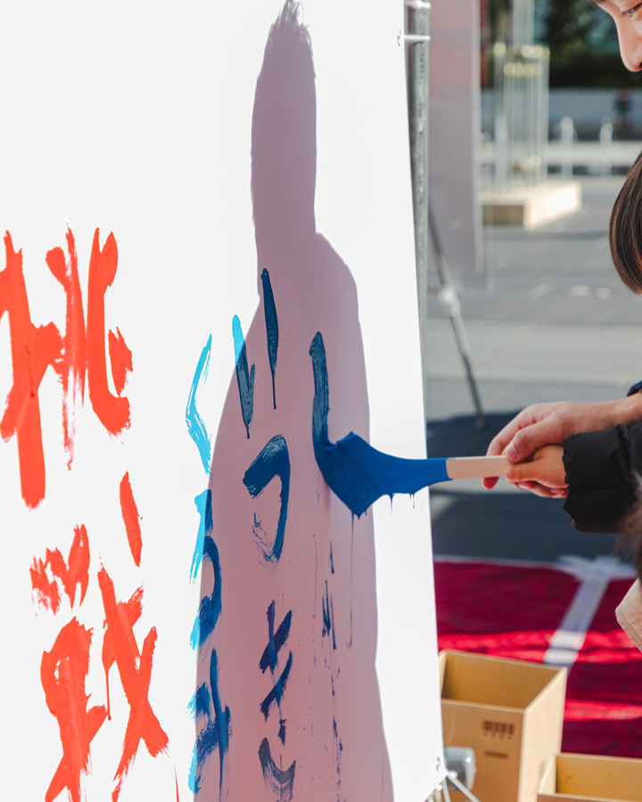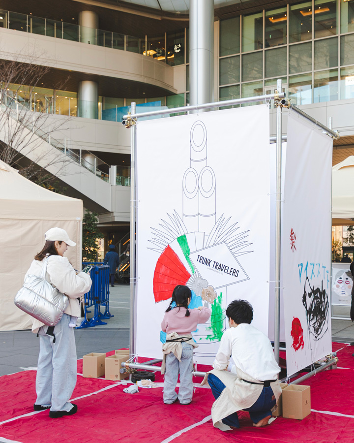 今回のメインコンテンツ、「みんなで書(描)き初め、モニュメントを作ろう!」 では、会場中央に真っ白なタープのキャンバスが登場し、一年の抱負や自由なイラストが次々と描き込まれていきました。完成していくモニュメントは私たちの想像を超える“作品”となり、皆さまの思いがひとつの形になっていく過程に、改めてこの企画の力強さを感じました。