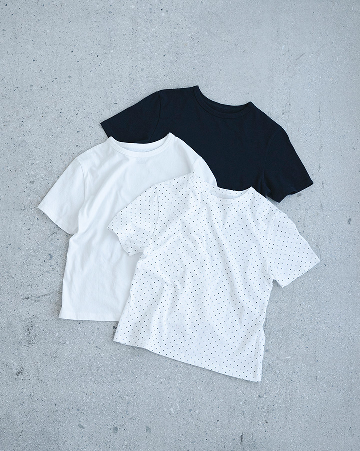 カラーはドット柄をベースにした WHT×DOT / NVY×DOT の2色展開。シンプルでありながら、着心地の良さと日常使いしやすい汎用性を追求したTシャツに仕上げました。