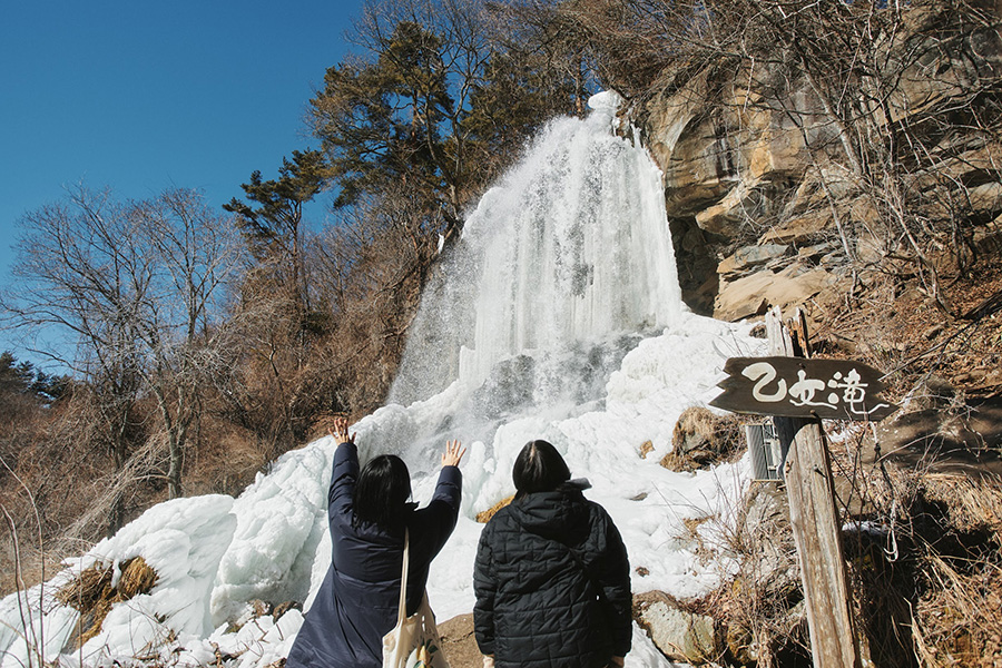 四季折々の景色を眺めてハイキングができる横谷渓谷の散策路を進んで最初にあるのが乙女滝。真冬の1〜2月は滝が凍って氷瀑となり、雪山登山をせずに冬の美しい景観を楽しめるのが魅力です。
