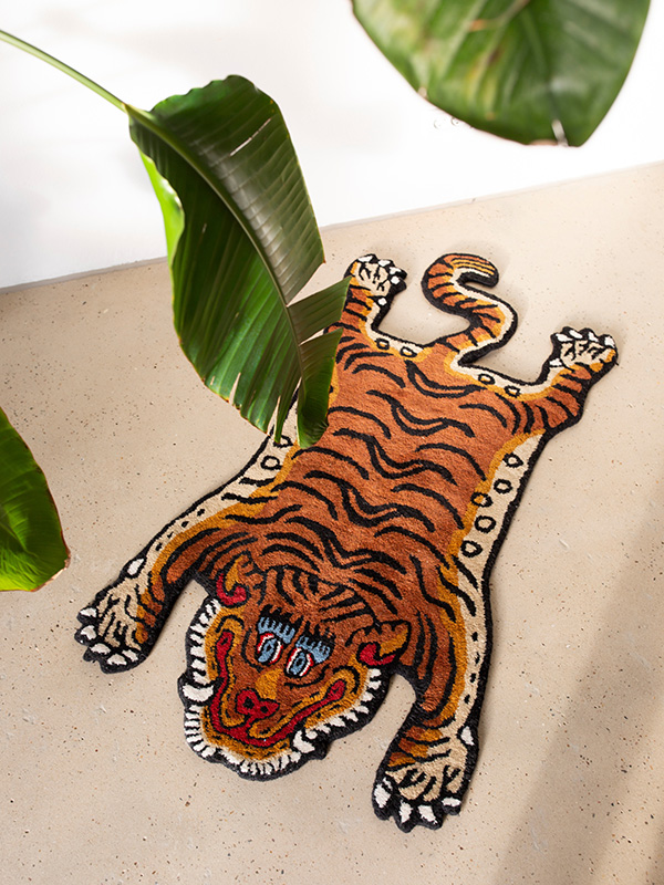 アイコンである「タイガーラグ」をはじめ、配色が目を引く厚手のタオルや、遊び心溢れる刺繍が施されたバッグ、さらに近年注目のアパレルラインまで幅広く展開。キッチュでエッジの効いたデザインは、日常に彩りとユーモアを添えてくれます。