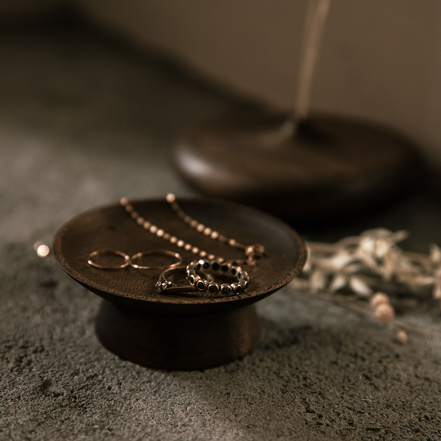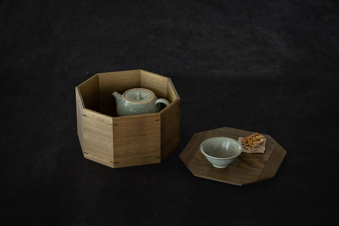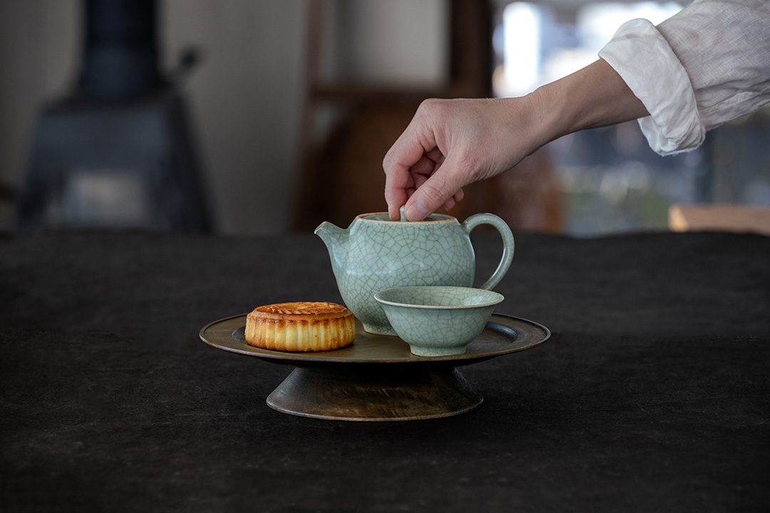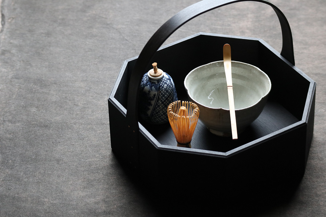今回は、オカモチや茶箱、高坏(たかつき)、高台菓子皿、バターケースのほか、新作としてアクセサリートレーと花器をご用意いただきました。