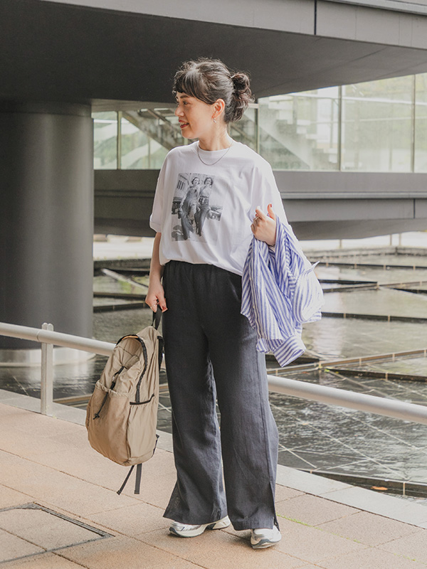 前回に引き続き、スタイリングで巧みにカバーする浪口流のアイテムが勢ぞろい。リネンのセットアップやラフに取り入れられるフォトTで、ゆるっとだけどちゃんと見えする。持っているだけで毎日の味方になるアイテムです。